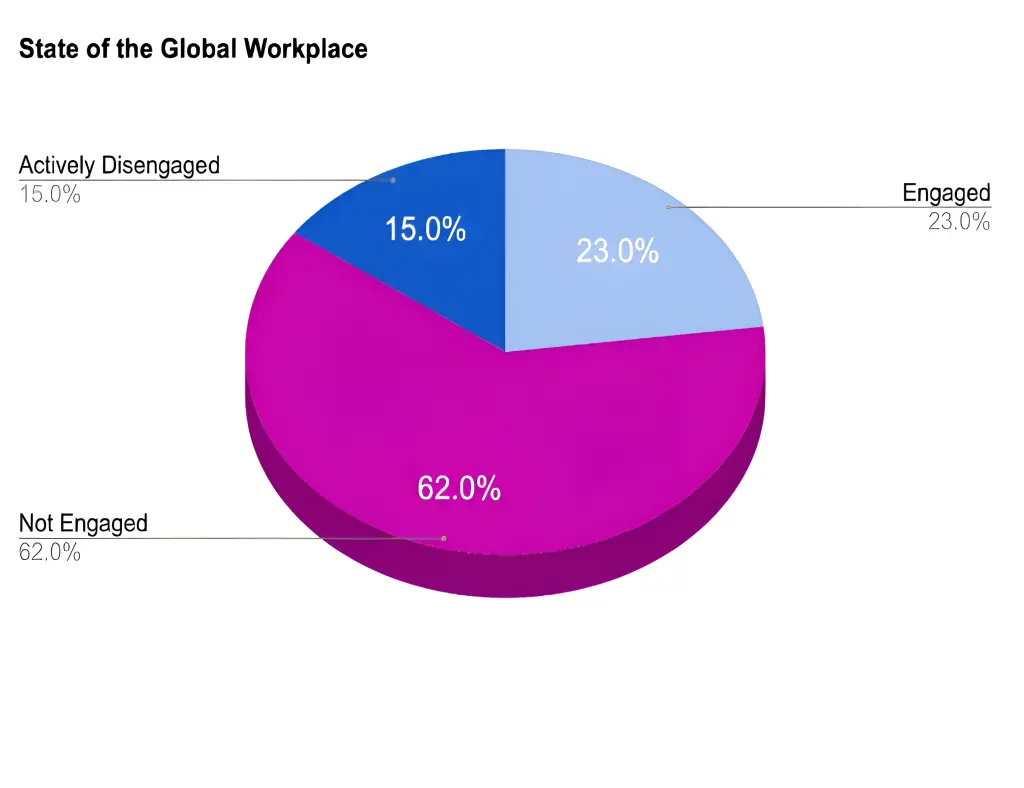 “A report on State of the Global Workplace by Gallup shows that globally employee engagement is at 23%, matching the record high from 2022. However, 62% of employees are not engaged, and 15% are actively disengaged”.